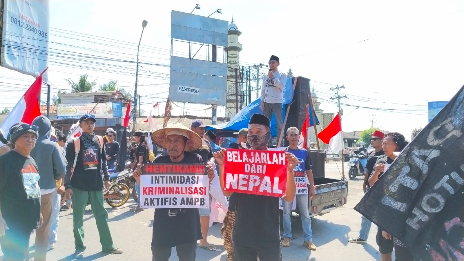 Massa mulai berbondong-bondong memadati Alun-Alun Tayu bagian Selatan pada pukul 12.30. Mereka membawa berbagai spanduk dan tulisan seperti “Hentikan Intimidasi Kriminalisasi Aktivitas AMPB”, “Aparat Pelindung Rakyat Bukan Pejabat”, “Belajarlah dari Nepal” dan lain-lain.