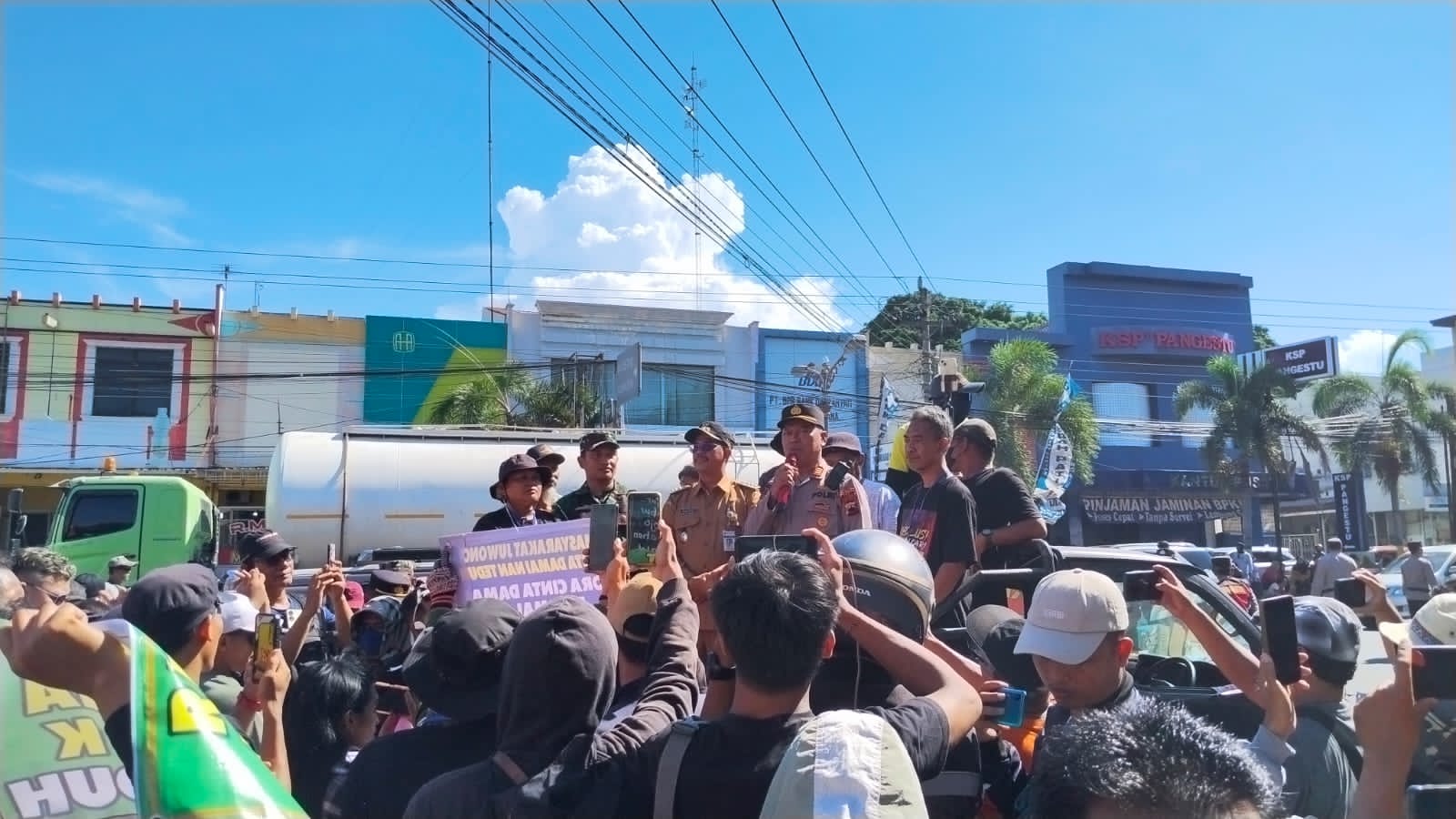 LINIKATA.COM, PATI – Camat Juwana Sunaryo hingga Kapolsek Juwana AKP Mudofar menemui massa demonstrasi di Alun-alun Juwana, Kabupaten Pati, Senin (13/10/2025). Massa yang tergabung dalam Koalisi Masyarakat Pati Anti Premanisme (Kompres) itu menuntut Polresta Pati segera menuntaskan kasus premanisme.