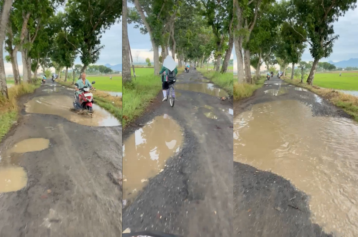 Dari video yang beredar di media sosial, ada di banyak titik lubang di jalan tersebut. Besarannya bervariasi dan yang paling parah sudah selebar jalan. Warga yang melintasi kubangan tersebut tampak berhati-hati agar tak terperosok.