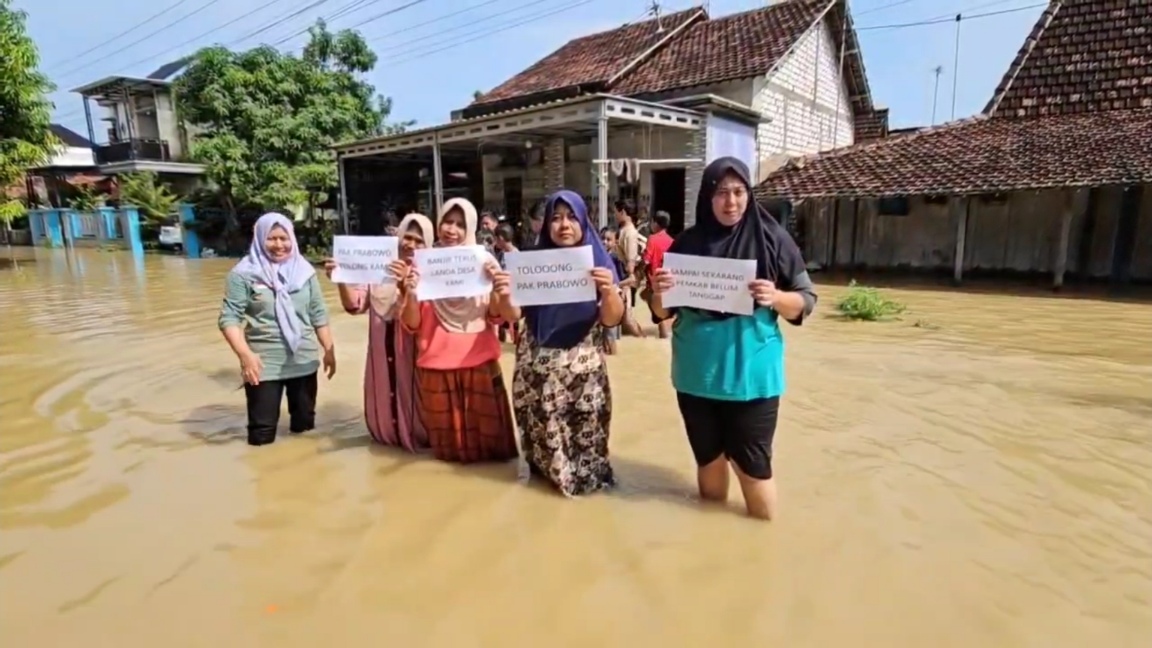 Kesal karena belum ada perhatian dari Pemerintah Kabupaten (Pemkab) Pati, sejumlah warga, terutama para ibu, menggelar aksi di tengah banjir dengan membentangkan tulisan, Senin (27/10/2025). Tulisan-tulisan itu berisi permintaan bantuan kepada Presiden Prabowo Subianto,