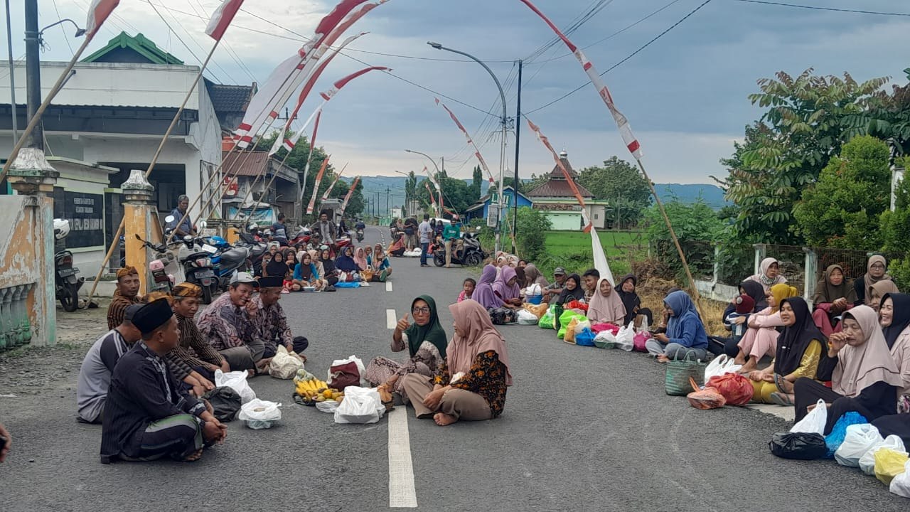 Karena saking banyaknya warga yang datang, mereka kemudian duduk di tengah jalan sambil mengikuti acara syukuran tersebut.