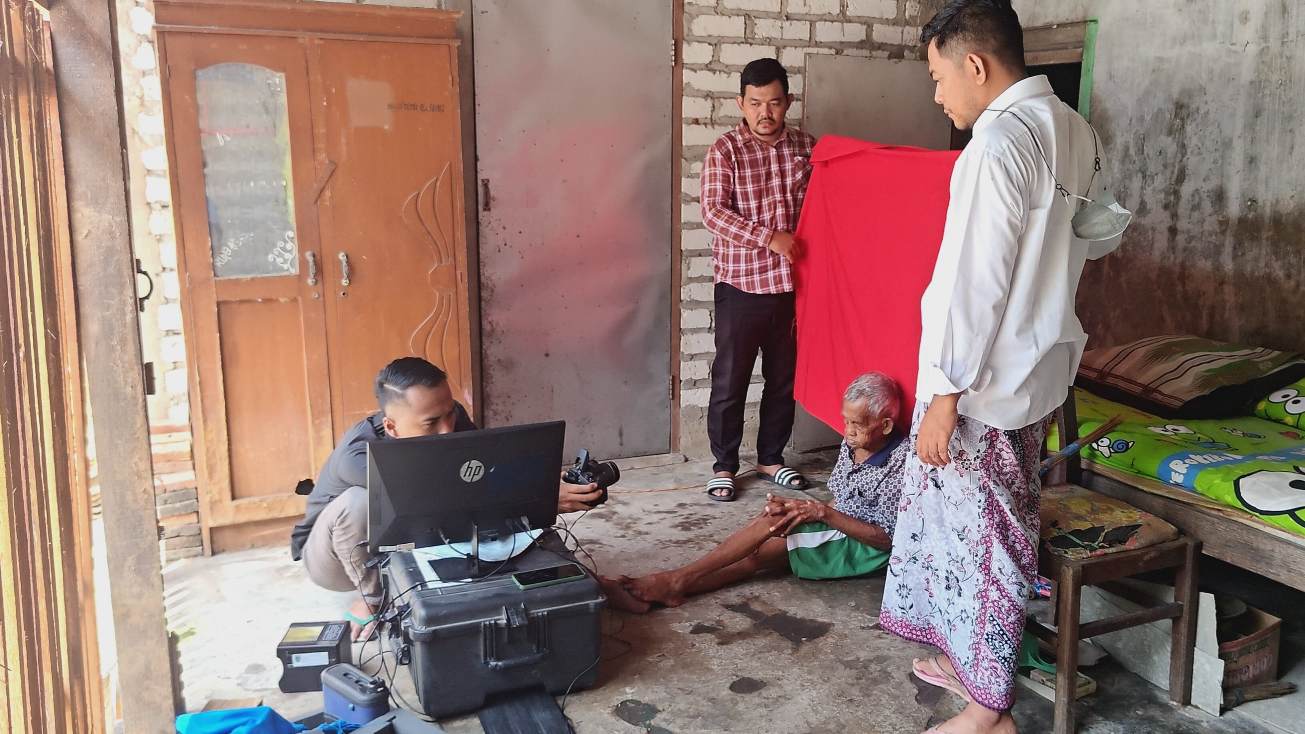 Setibanya di lokasi, petugas langsung menyiapkan peralatan perekaman e-KTP yang dibawa menggunakan koper khusus. Mengingat kondisi kesehatan Mbah Karmidi yang tidak memungkinkan berpindah tempat, proses perekaman dilakukan di ruang dekat tempat tidurnya.
