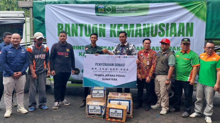 LINIKATA.COM, JEPARA – Bupati Jepara Witiarso Utomo melepas bantuan kemanusiaan untuk korban bencana di Sumatera Barat di Halaman Setda Jepara, Jumat (19/12/2025). Bantuan logistik satu truk dan uang tunai ratusan juta rupiah tersebut berasal dari hasil donasi masyarakat dan Aparatur Sipil Negara (ASN).