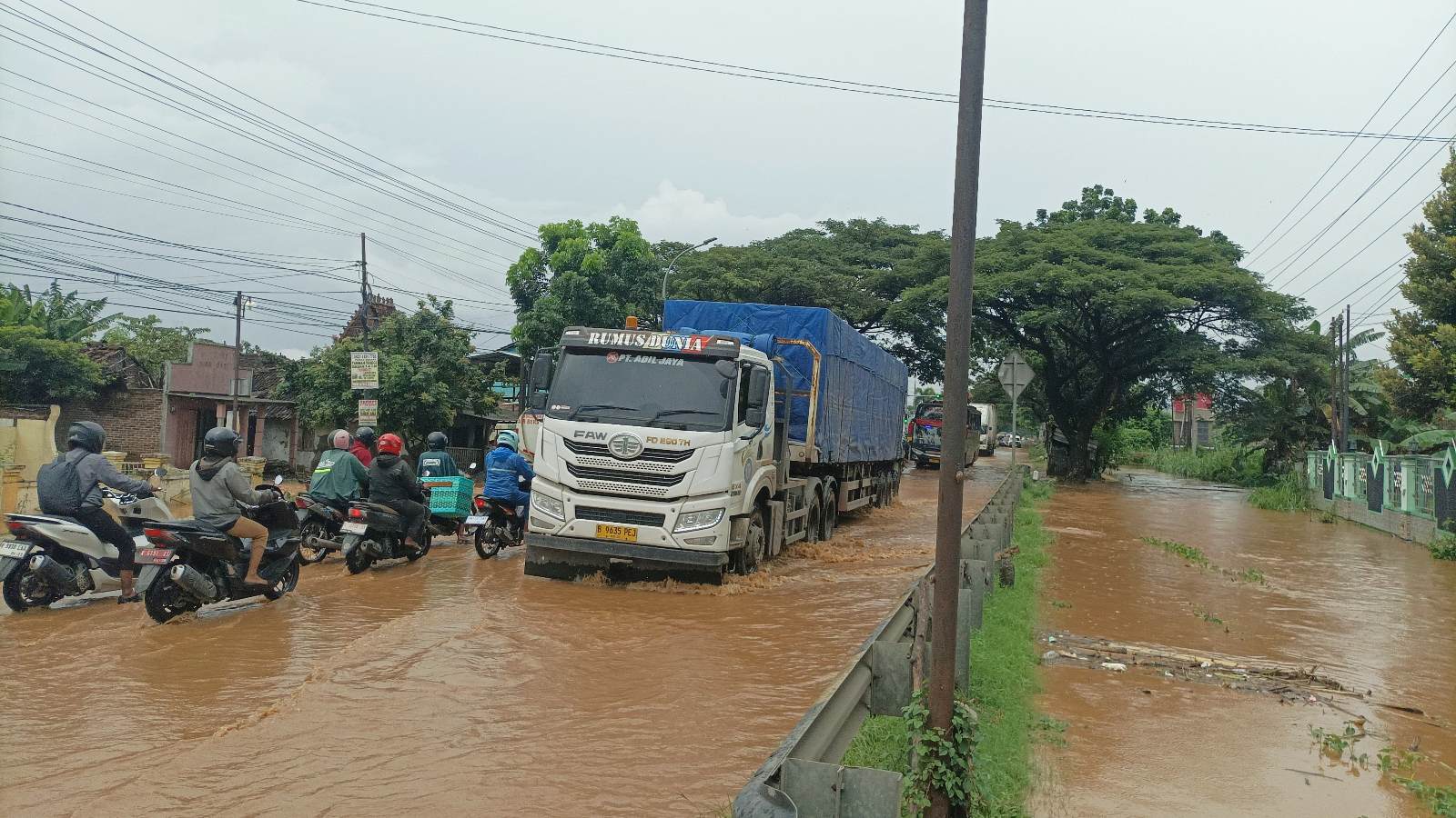 Pantauan di lokasi, banjir itu menggenangi Jalan Pantura sepanjang ratusan meter dari pertigaan Jalan Lingkar Selatan (JLS) ke arah Timur. Berbagai kendaraan juga harus melaju pelan dari dua arah.