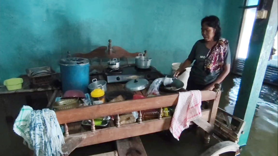 “Air sudah sampai segini, tapi kami tetap di rumah. Tidur di atas dipan yang ditinggikan. Kalau masak juga di atas kasur,” ujar Ritka.