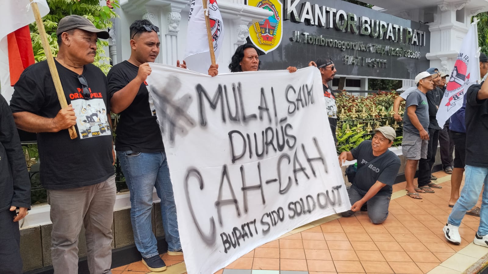 Pantauan di lokasi, puluhan massa mulai memadati Alun-Alun Pati sekitar pukul 13.00 WIB. Mereka kemudian berjalan menuju depan Kantor Bupati Pati dengan membentangkan dua tulisan. Salah satunya berisi, Mulai Saiki Diurus Cah-cah. Bupati Pati sido Sold Out’.
