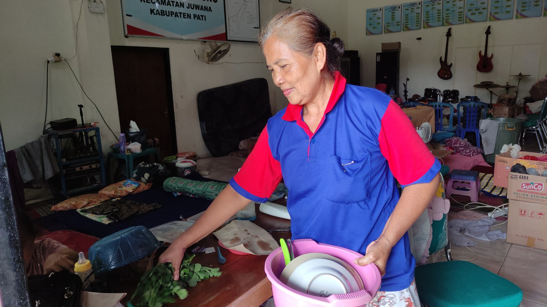 Masudah sedang beraktivitas di Posko Pengungsian di Balai Desa Doropayung, Juwana, Pati. Foto: Linikata/LK1
