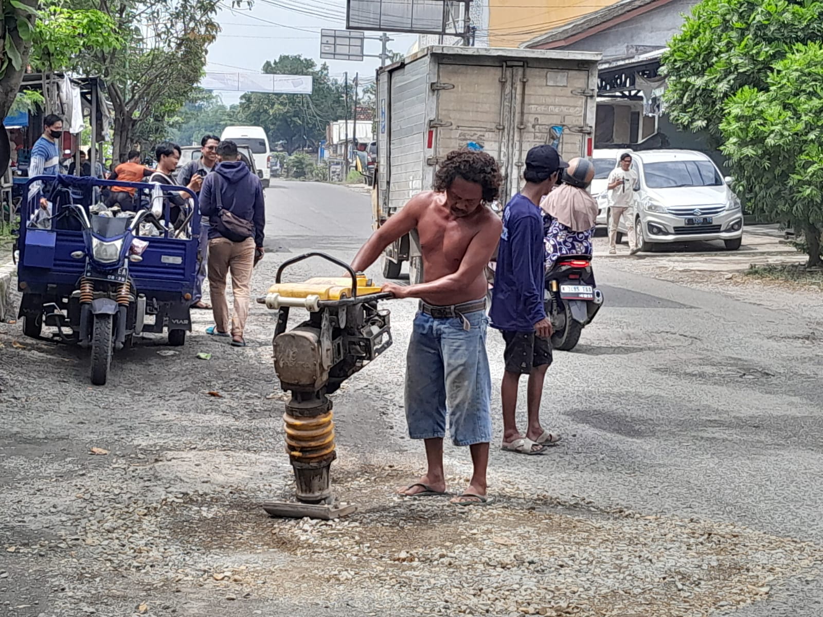 Pantauan di lokasi, belasan warga terlihat bahu membahu mengangkut meterial penambal jalan dari sebuah pikap dan motor roda tiga. Mereka menguruk jalan berlubang dengan lebar dan kedalaman bervariasi pakai batu dan base course. Setelahnya, urukan material itu diratakan dengan alat stamper.