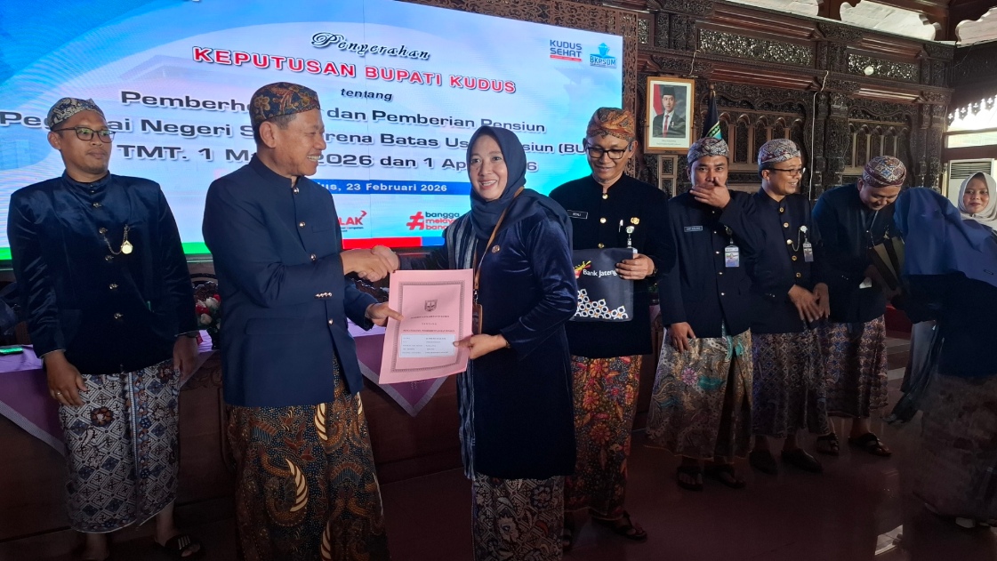 LINIKATA.COM, KUDUS – Gerbong purnatugas di lingkungan Pemkab Kudus terus bergerak. Bupati Kudus, Sam’ani Intakoris, baru saja menyerahkan Surat Keputusan (SK) Pensiun kepada 68 Aparatur Sipil Negara (ASN), yang memasuki masa purnabakti per Maret dan April 2026, di Pendapa Kabupaten, Senin (23/2/2026).