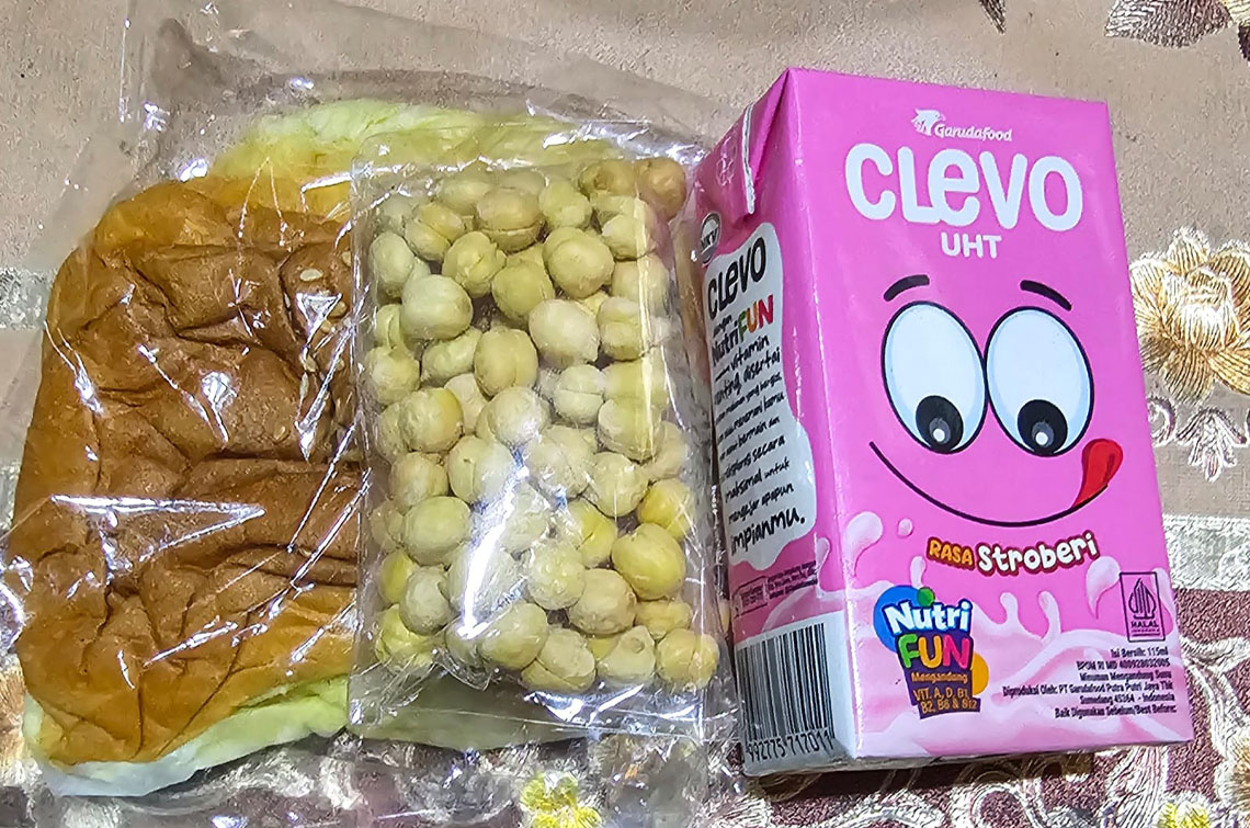 Sebagian besar menu yang dibagikan berupa buah-buahan seperti pisang atau jeruk, roti, dan kacang, yang terkadang ditambah susu atau sari kacang hijau.