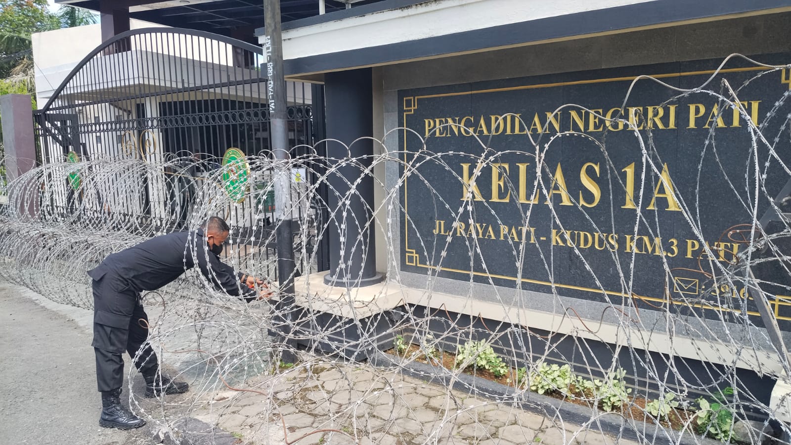 Pantauan di lokasi, sejumlah aparat kepolisian mulai memasang kawat berduri sejak pukul 13.00 WIB. Kawat tersebut dipasang di sepanjang pagar depan PN Pati dan menyisakan satu pintu gerbang untuk keluar masuk. Sedangkan pintu gerbang utama tampak ikut dipasangi.