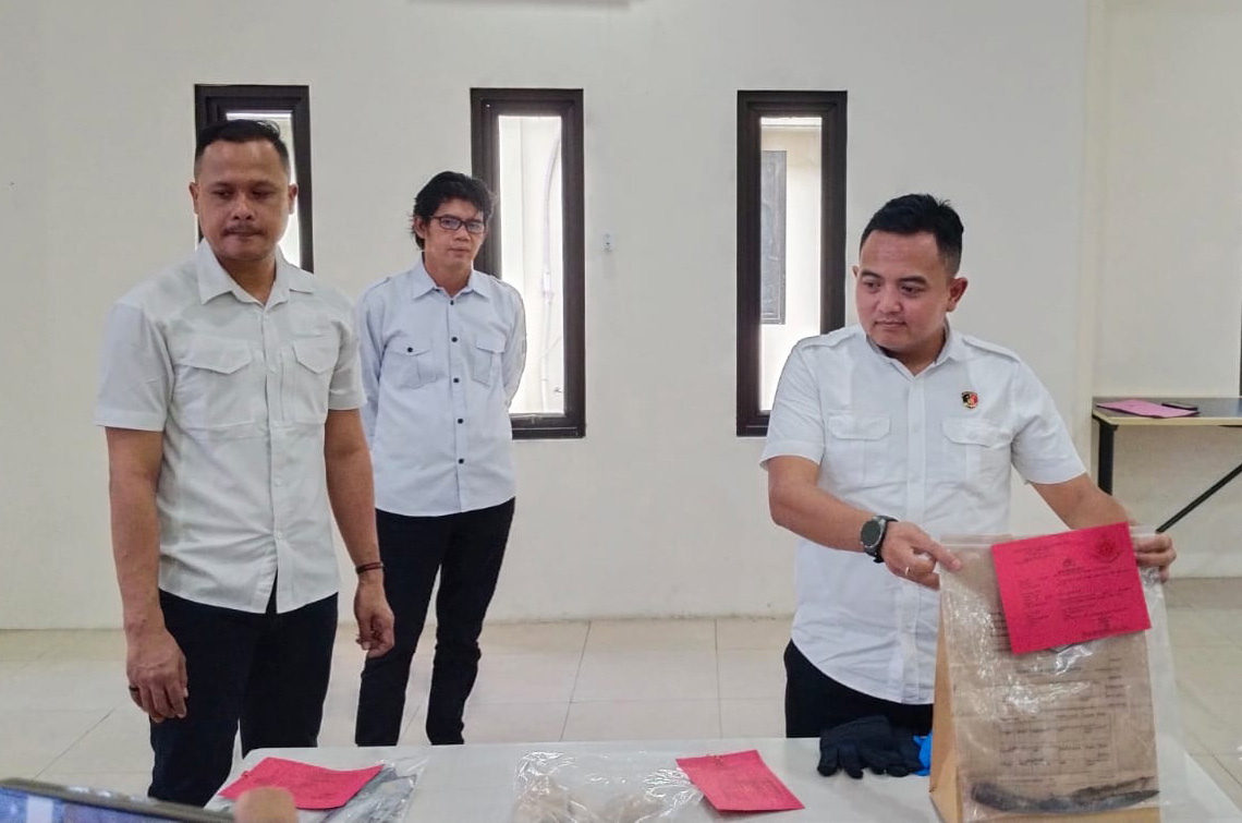 Kasat Reskrim Polresta Pati, Kompol Dika Hadian Widyatama (tengah) menunjukkan barang bukti kasus kasus tongtek maut di Mapolresta Pati, Senin (16/3/2026). Foto: Linikata/LK1