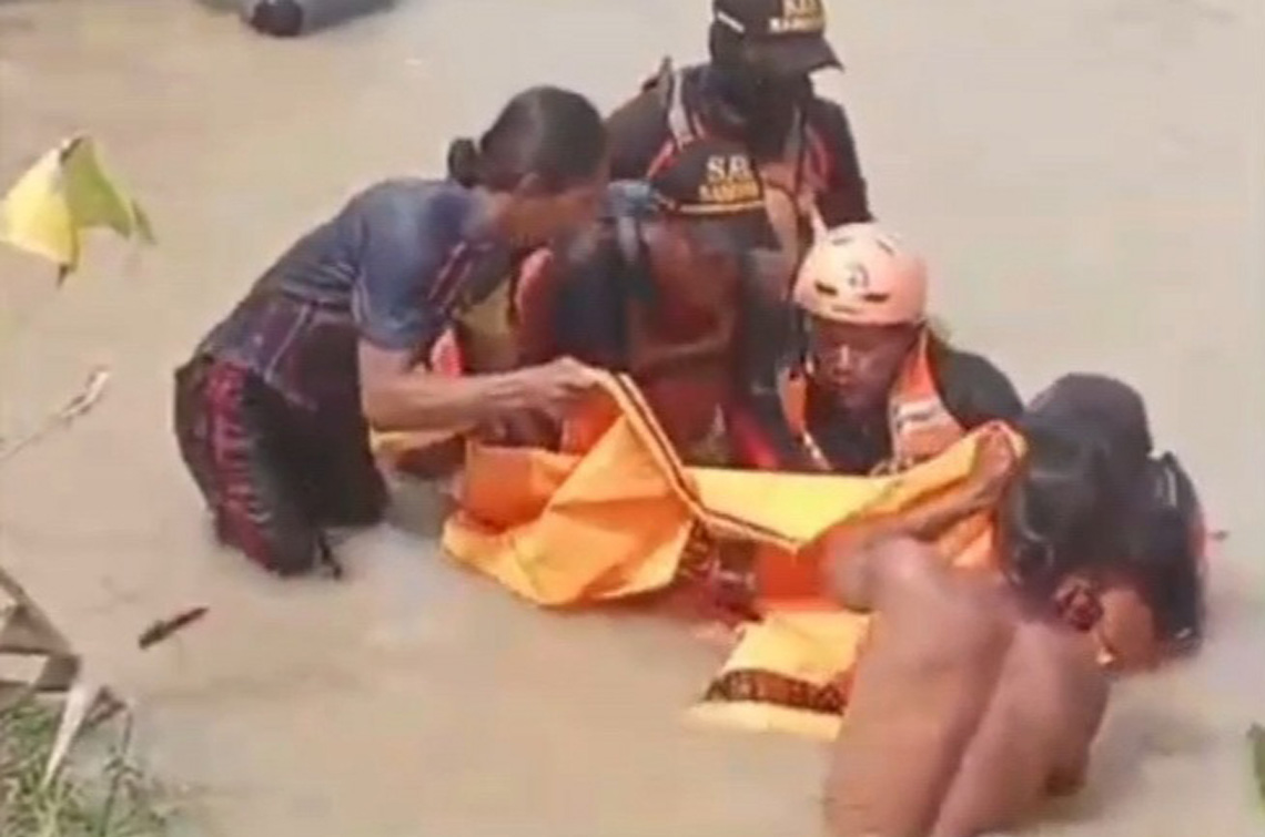 Relawan mengevakuasi jenazah warga yang tenggelam di area banjir. Foto: Istimewa